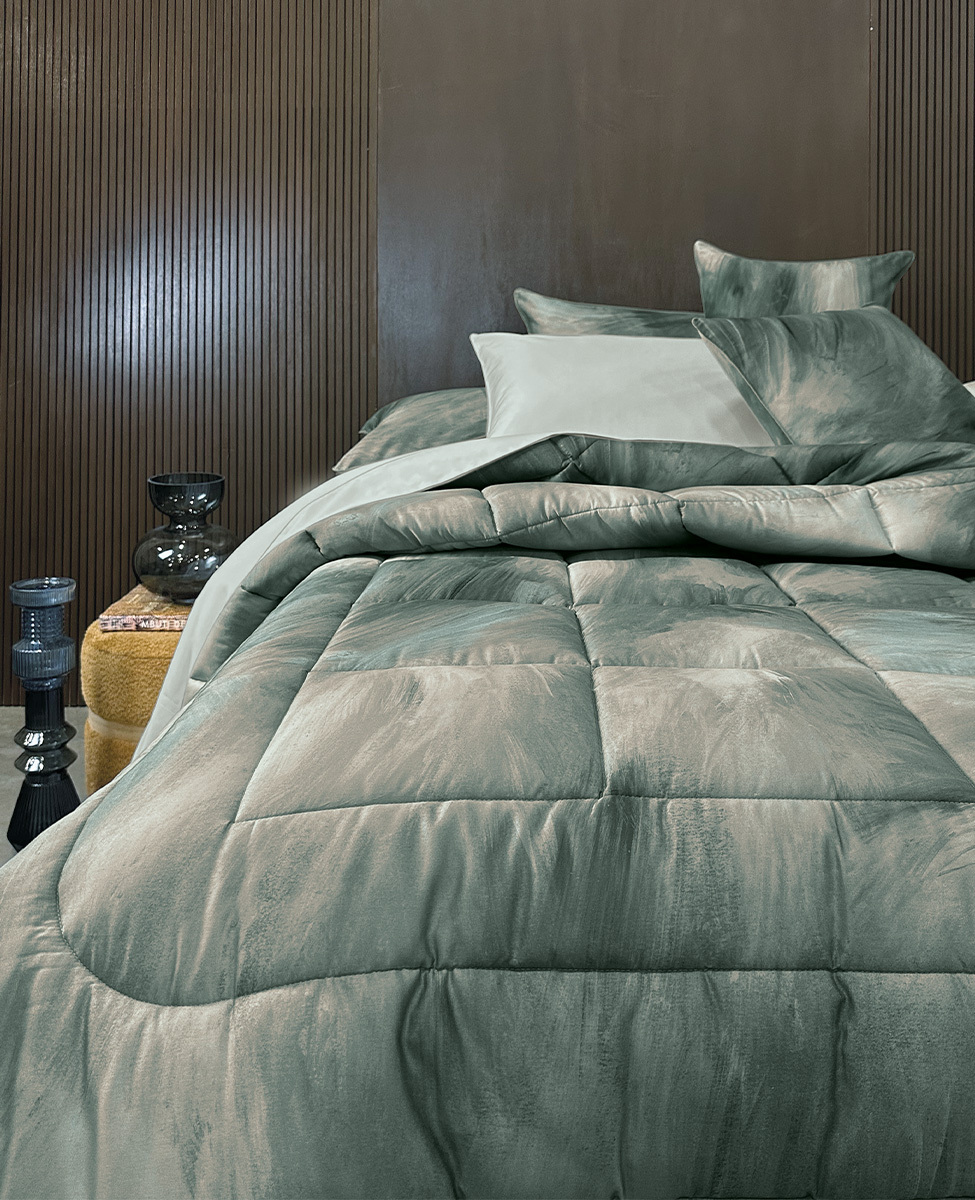 Calda trapunta matrimoniale con disegno stampato all-over.