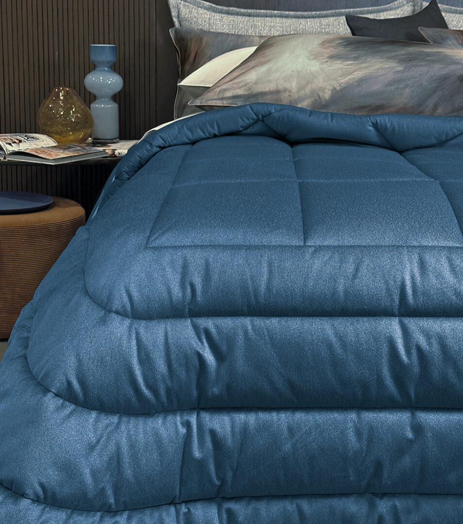 Calda e avvolgente trapunta matrimoniale con disegno jacquard in tinta unita.